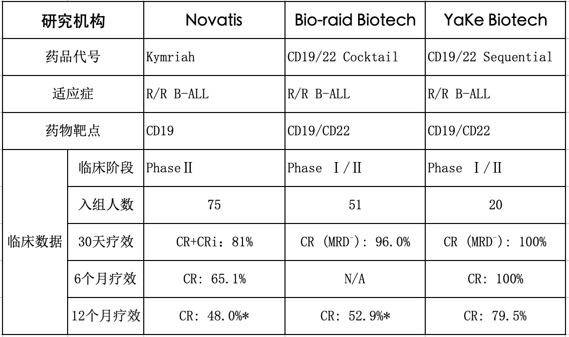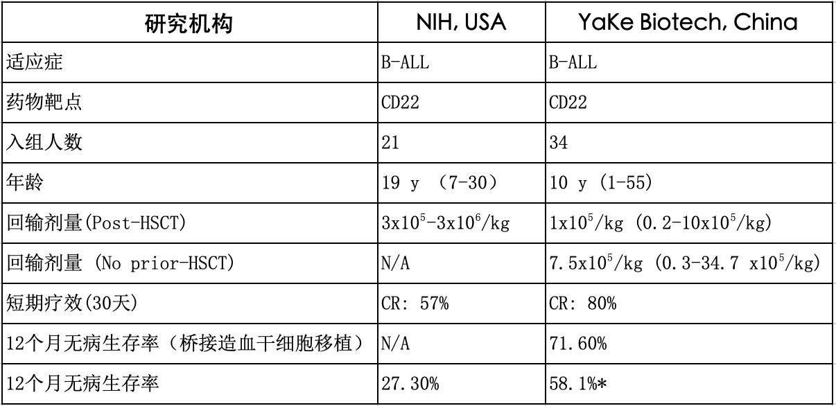 表一、比較針對(duì)CD22靶標(biāo)CAR-T細(xì)胞治療的國際前沿臨床研究結(jié)果: