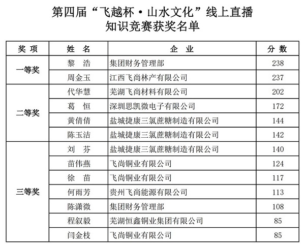 1月13日晚,飛尚集團(tuán)第四屆“飛越杯·山水文化”線上直播知識(shí)競(jìng)賽正式結(jié)束。根據(jù)競(jìng)賽規(guī)則,統(tǒng)計(jì)所有參賽者的最終得分,飛尚集團(tuán)財(cái)務(wù)管理部黎浩、江西飛尚林產(chǎn)有限公司周金玉分別以238分、237分的成績(jī)獲得一等獎(jiǎng),蕪湖飛尚材料有限公司獲得最佳組織獎(jiǎng)。