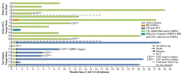 CD7 CAR T細(xì)胞是一種新型的癌癥免疫治療方法,它可以通過(guò)基因修飾T細(xì)胞使其能夠識(shí)別和攻擊表達(dá)CD7的癌細(xì)胞,在治療CD7陽(yáng)性的T細(xì)胞惡性腫瘤和急性髓系白血病(AML)上具有很大的潛力。在先前的一項(xiàng)I期試驗(yàn)報(bào)告中,供體來(lái)源的CD7定向嵌合抗原受體(CAR)T細(xì)胞在難治或復(fù)發(fā)的T細(xì)胞急性淋巴細(xì)胞白血病(r/r T-ALL)患者中顯示出可行性和早期療效2。在此,我們報(bào)告了該療法在2年隨訪后的長(zhǎng)期安全性和療效。