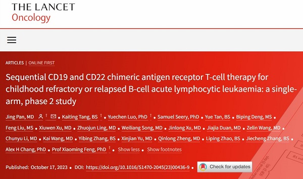 近日,上海雅科生物科技有限公司CAR-T細胞治療臨床合作再傳喜訊,以潘靜主任領銜的北京博仁醫院醫療團隊在國際腫瘤學頂級學術期刊《The Lancet Oncology》(IF=51.1)上再次發表了突破性的臨床研究文章:Sequential CD19 and CD22 chimeric antigen receptor T-cell therapy for childhood refractory or relapsed B-cell acute lymphocytic leukaemia: a single-arm, phase 2 study。